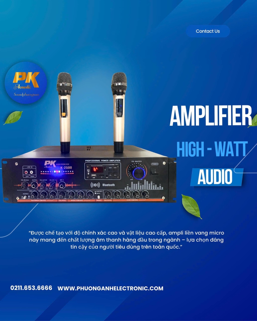 Hệ thống điều chỉnh âm thanh bằng vang cơ (có thể điều chỉnh bass, treble, đường micro và âm lượng) và 2 micro đi kèm sử dụng tần sóng UHF bắt xa lên tới 50m .